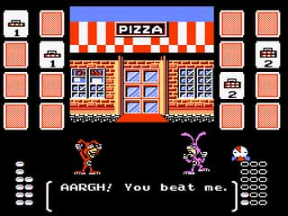 But this isn't the worst. Nay! The worst is the pizza-eating contest at the end of every other level (1, 3, 5, etc). I suppose it's an attempt to make the world overweight by eating fattening pizzas (to the profit of rich Domino's Pizza delivery boys the world over) since the goal is to out-eat your opponent. The opponents only differ in the colors of their (Noid-like) outfits. Each claim to be the "pizza eating champion," as if that's something to shoot for. All I know is that Loge could kick all of their asses.